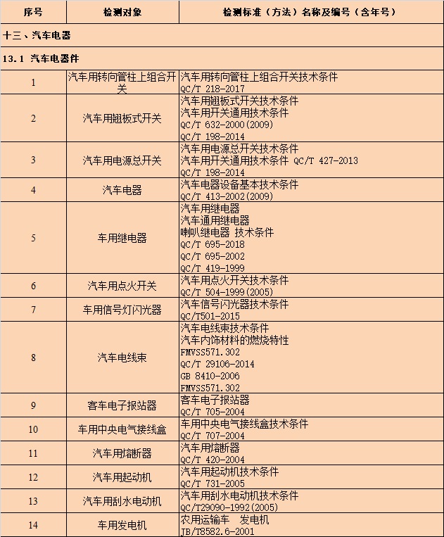 可按照國家標準、行業標準、企業標準及國際上一些先進標準(如:ISO、IEC、SAE、DIN、JIS 等)開展汽車電子電氣產品質量監督和檢驗工作,為用戶提供交流發電機、起動機、汽車用各類微型電機及總成、汽車用各類開關、繼電器、分電器、點火線圈、低壓線束、汽車用電線、汽車用閃光燈、喇叭、中央電氣熔斷器、點火控制組件等汽車用電機、電器及電子產品的檢驗服務。