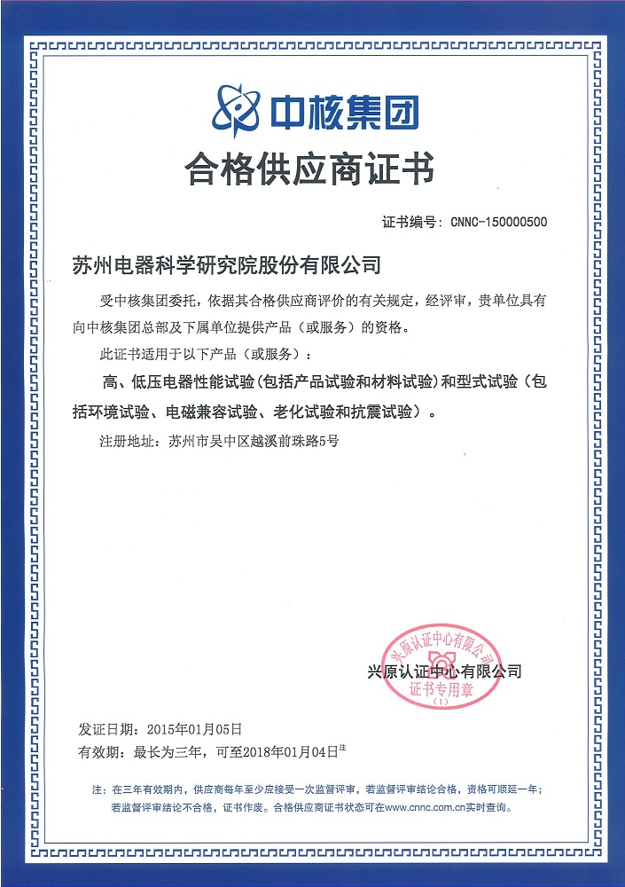蘇州電科院取得中核集團(tuán)合格供應(yīng)商證書
