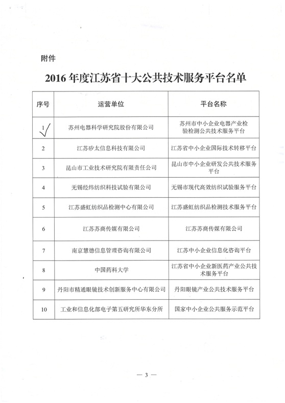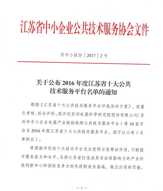 本次活動(dòng)根據(jù)《江蘇省十大公共技術(shù)服務(wù)平臺(tái)評(píng)選活動(dòng)方案》,經(jīng)量化考核、綜合評(píng)價(jià),最終評(píng)選出包括蘇州電器科學(xué)研究院(蘇州市中小企業(yè)電器產(chǎn)業(yè)檢驗(yàn)檢測(cè)公共技術(shù)服務(wù)平臺(tái))在內(nèi)的10家平臺(tái)為2016年度江蘇省十大公共技術(shù)服務(wù)平臺(tái)。