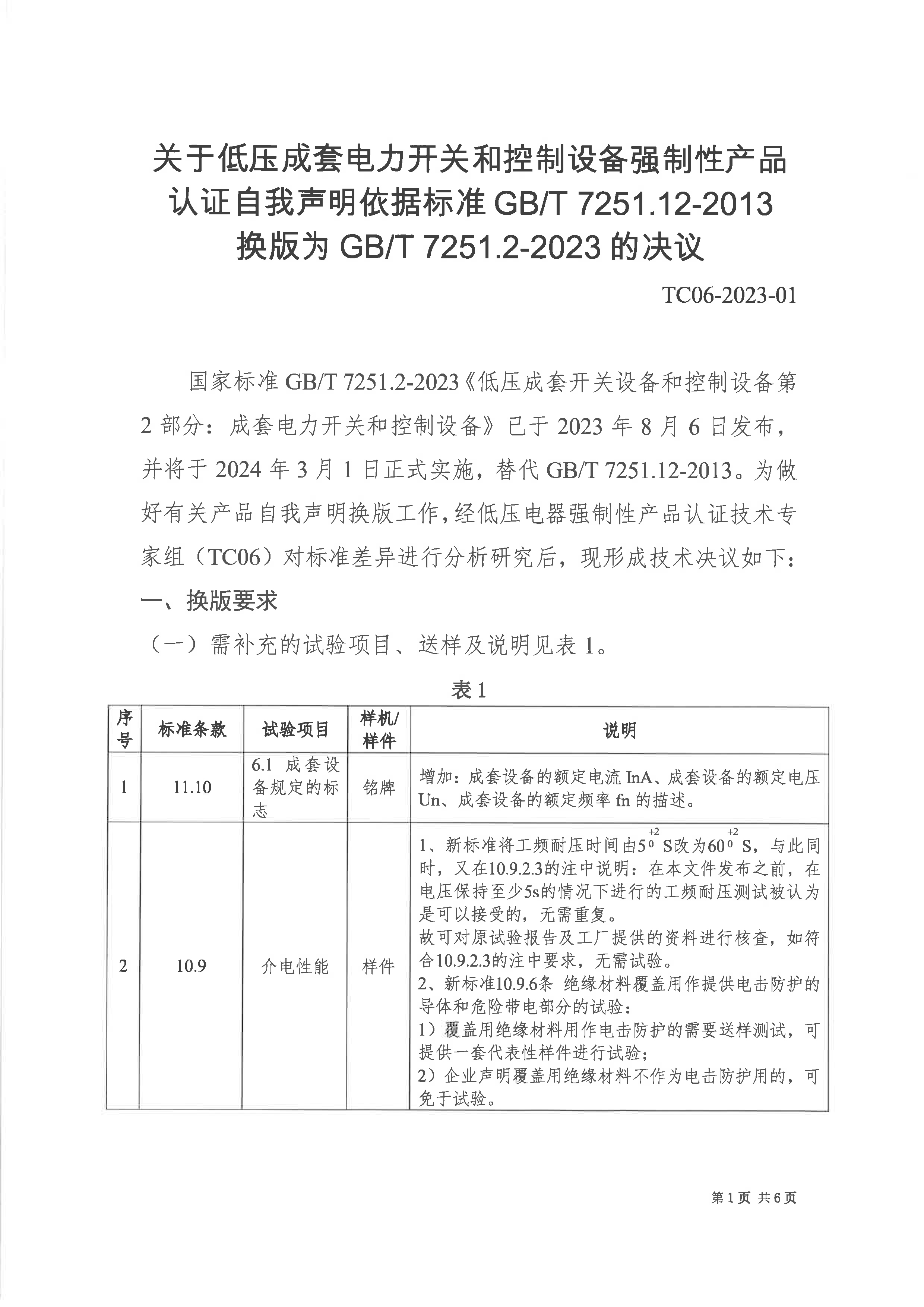 TC06低壓電器技術專家組秘書處發布的《關于低壓成套成套電力開關和控制設備強制性產品認證自我聲明依據標準GB/T7251.12-2013換版為GB/T7251.2-2023的決議》換版決議: