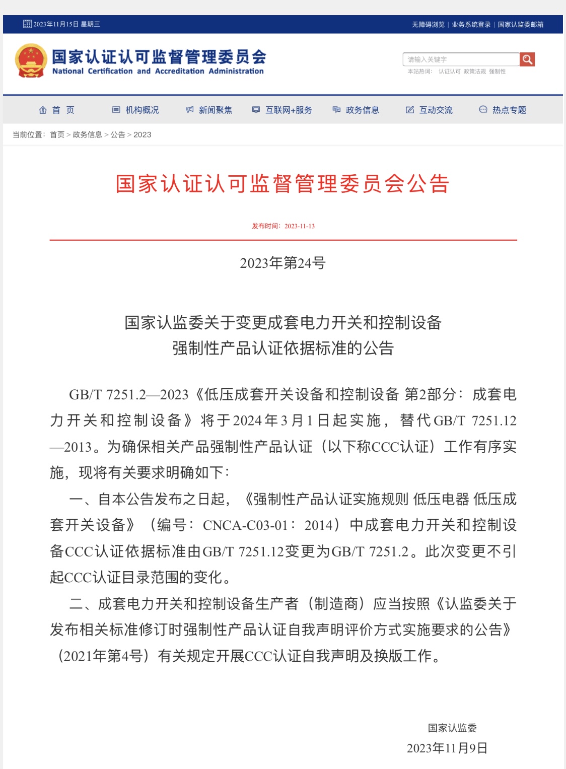 國家認監委關于GB/T7251.12-2013成套電力開關和控制設備強制性產品認證依據標準變更為GB/T7251.2-2023的公告及換版決議已發布。