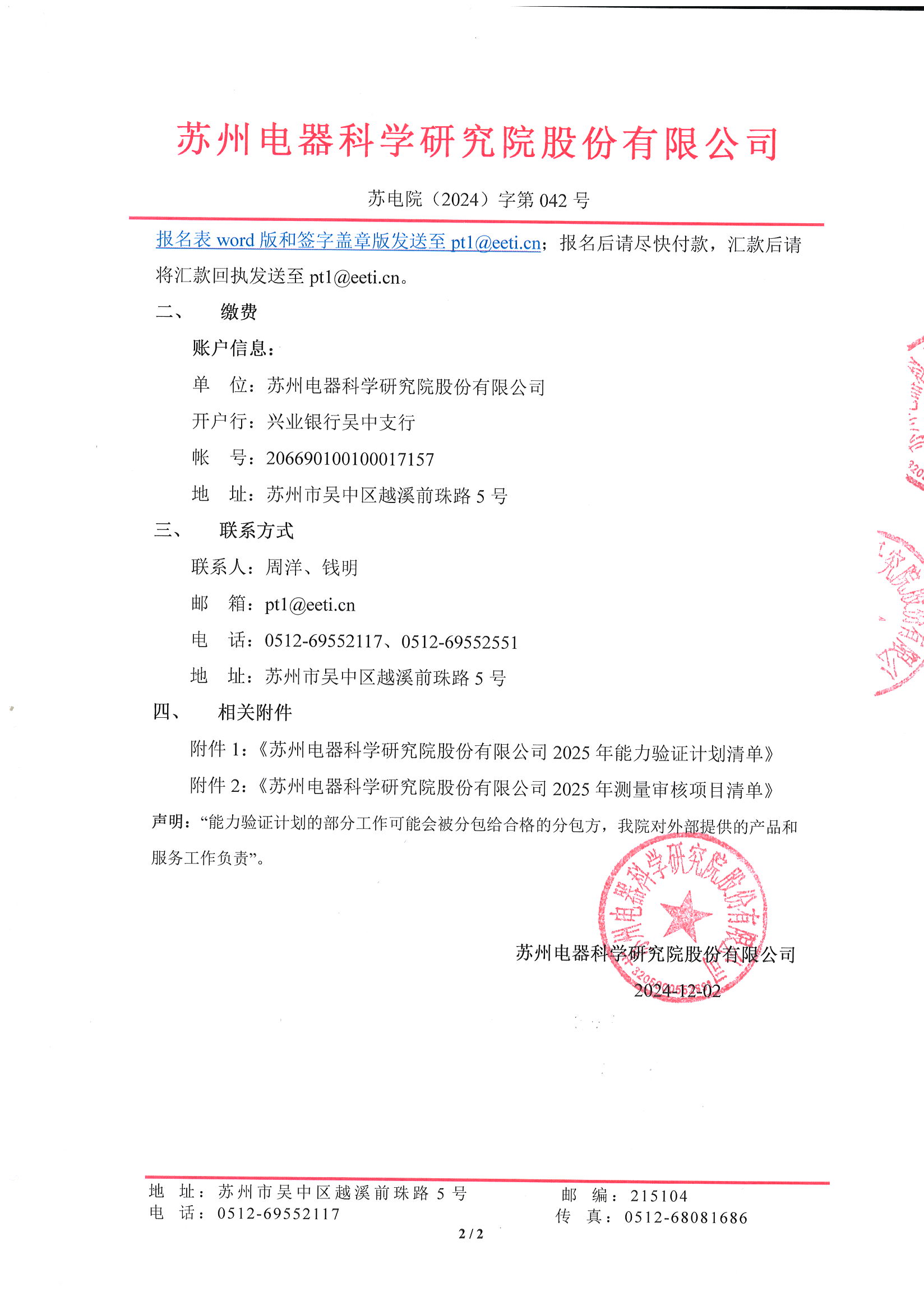 附件 蘇州電器科學(xué)研究院股份有限公司2024年能力驗(yàn)證計(jì)劃報(bào)名表